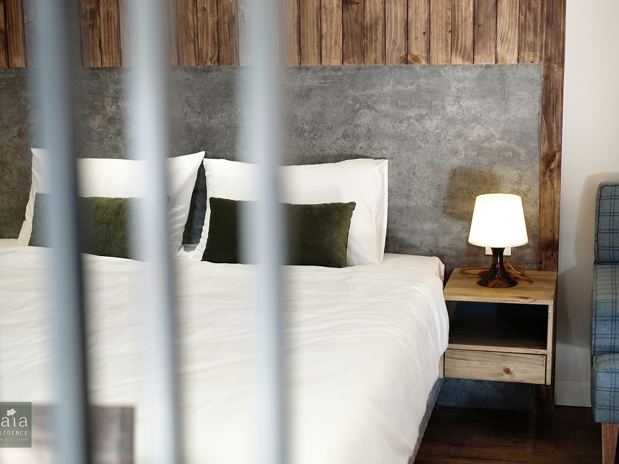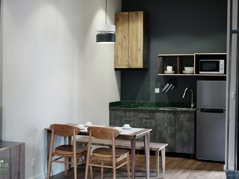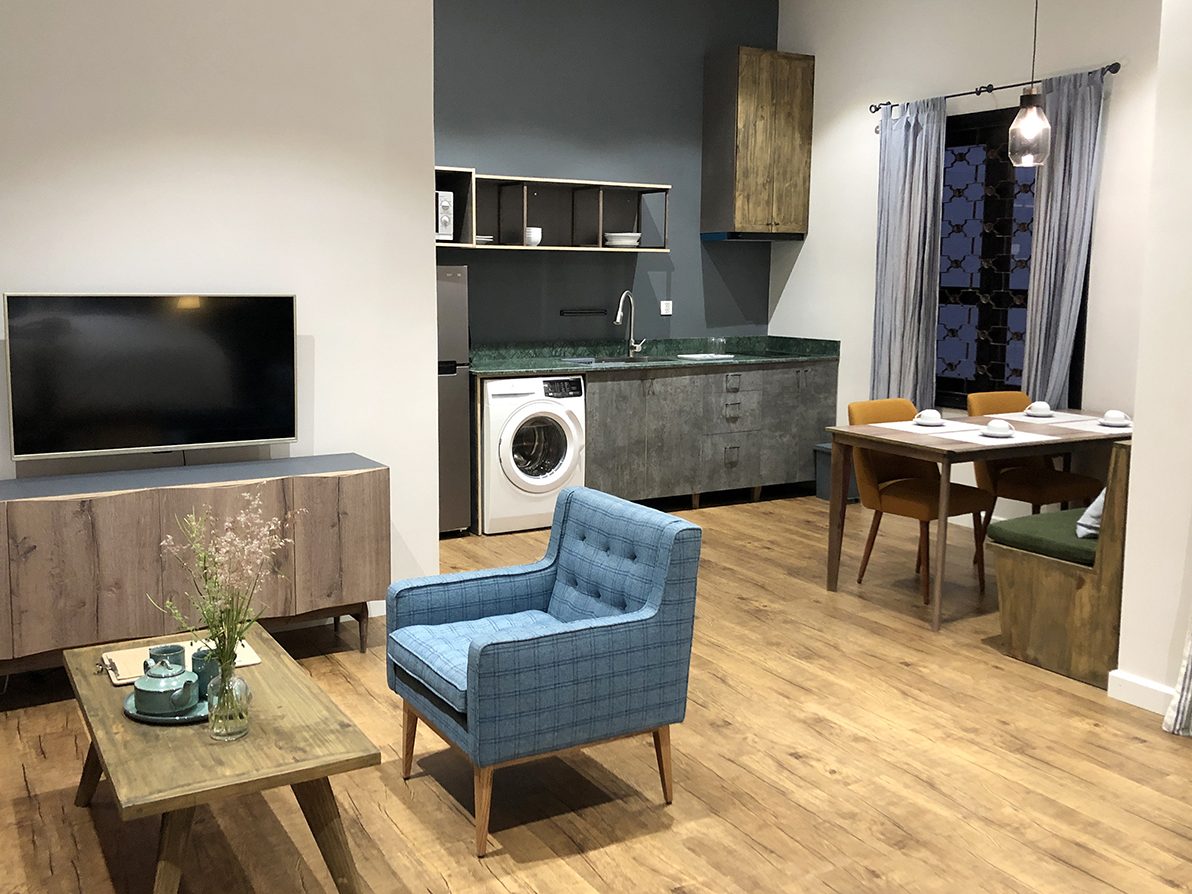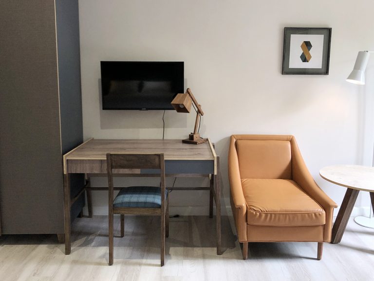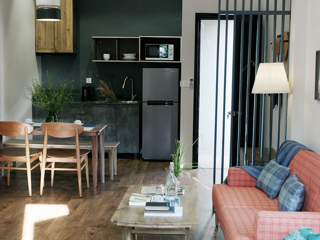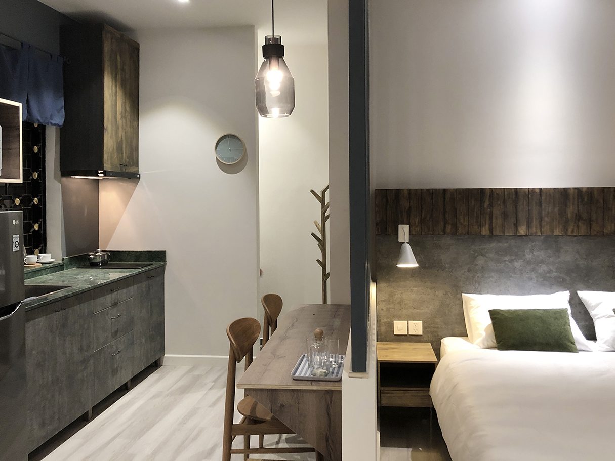Each room featured by a private balcony, overlooking the green garden view, a well-equipped kitchen, and a custom writing desk pairing with a wide variety of armchairs and sofas, provides a relaxing yet cozy & homelike-feeling living space.