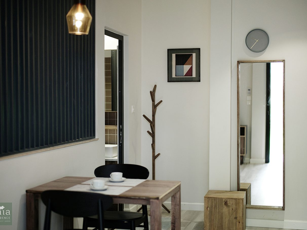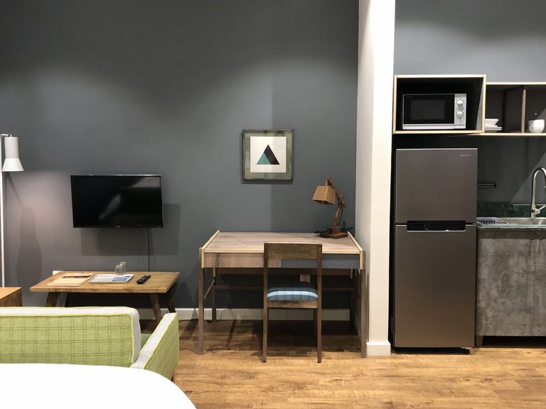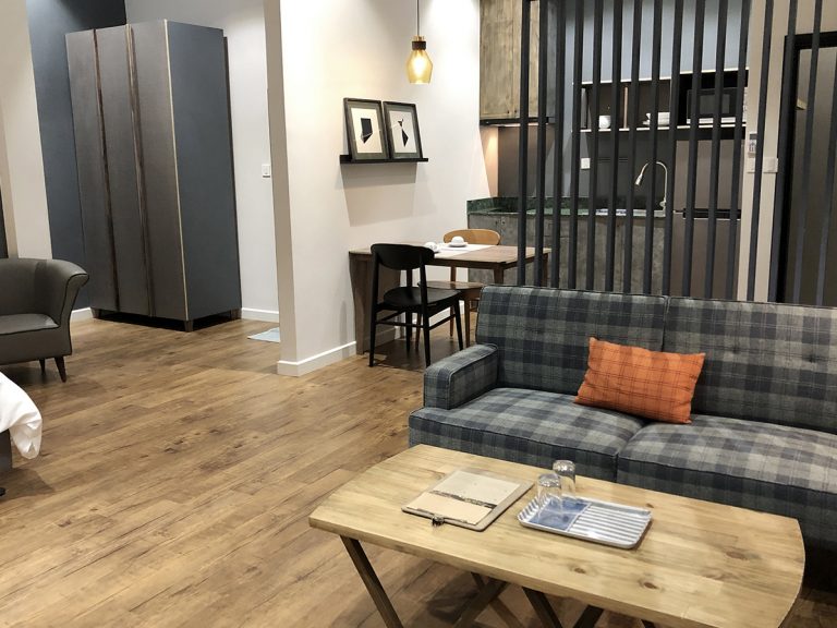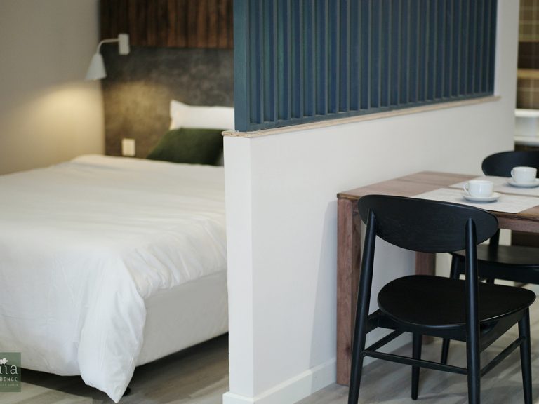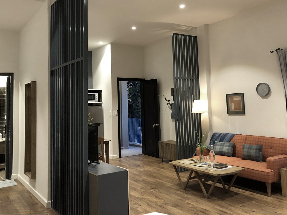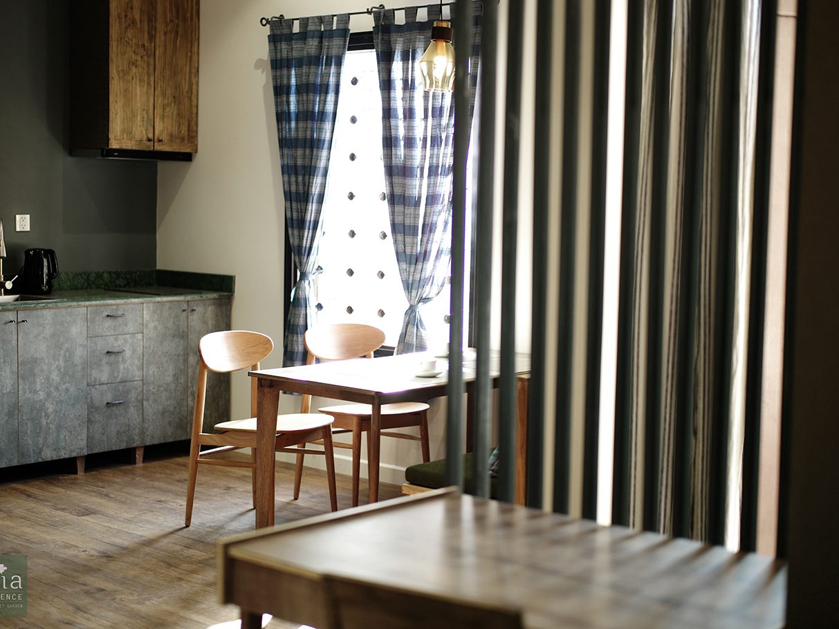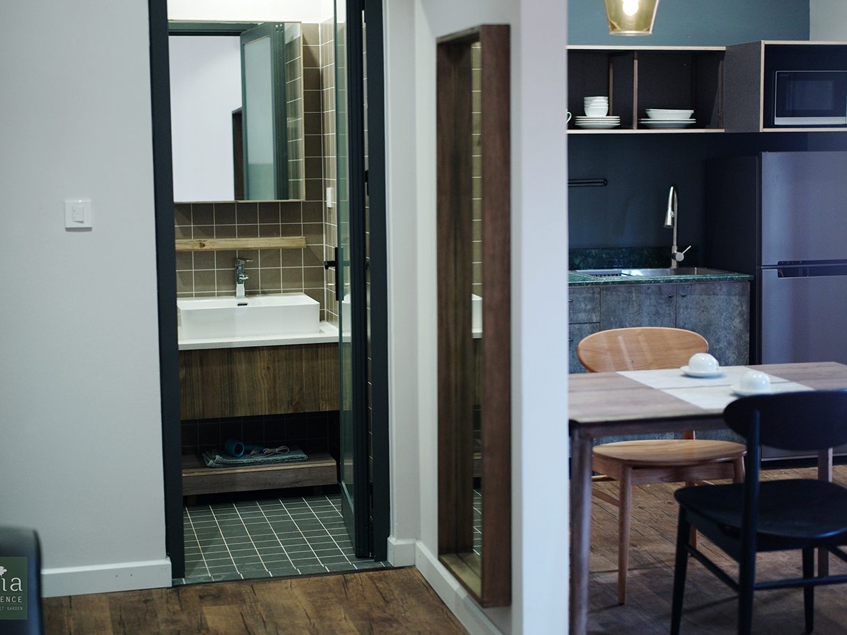 Each room featured by a private balcony, overlooking the green garden view, a well-equipped kitchen, and a custom writing desk pairing with a wide variety of armchairs and sofas, provides a relaxing yet cozy & homelike-feeling living space.