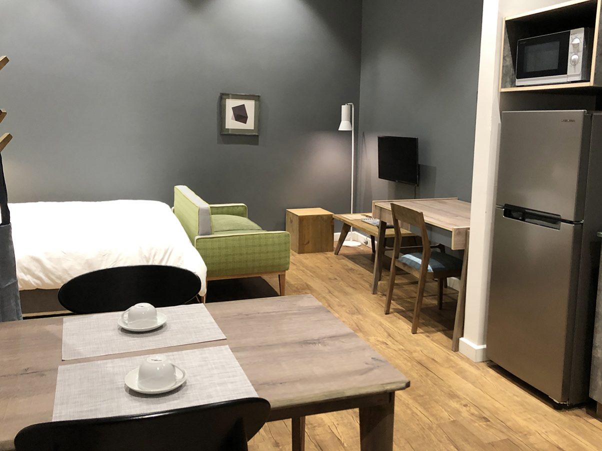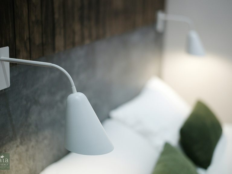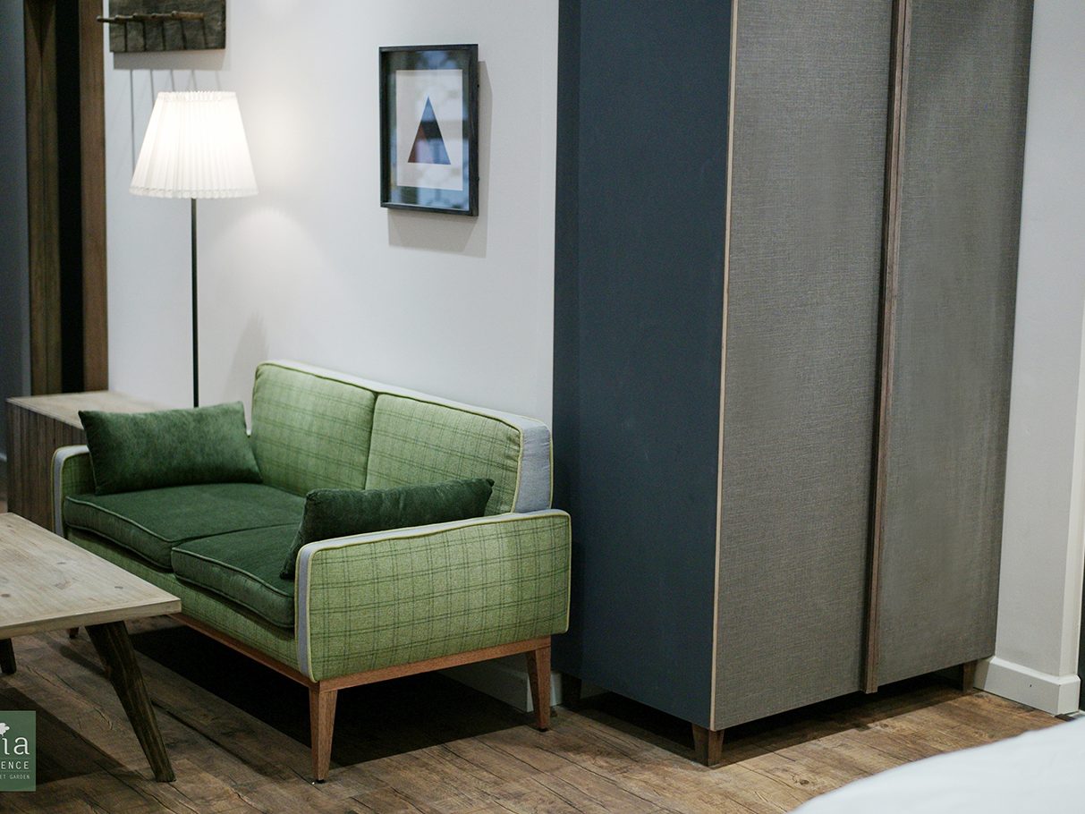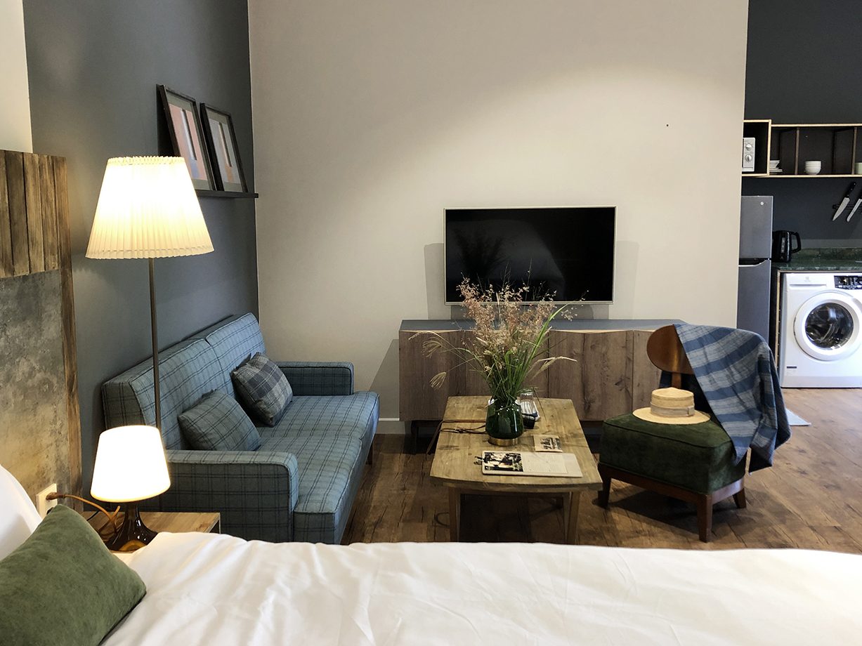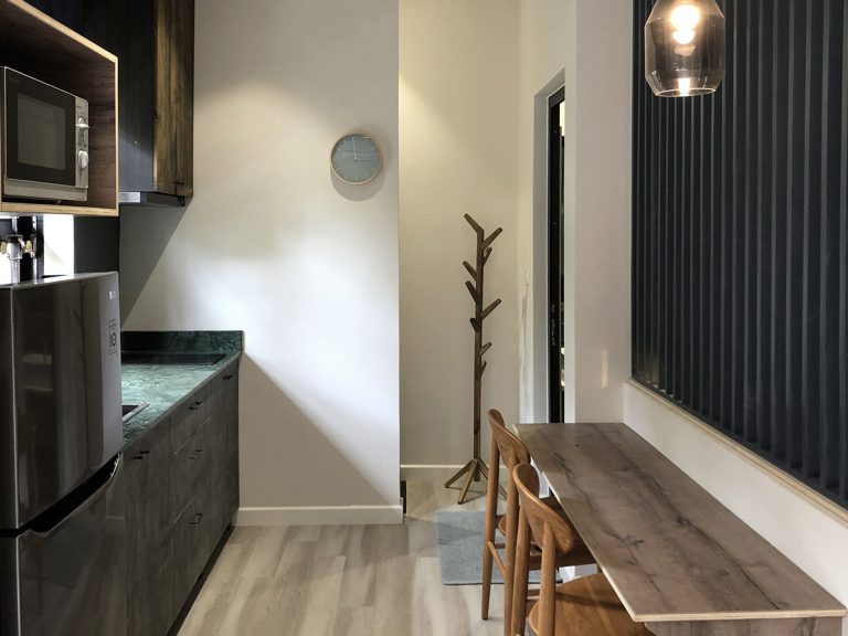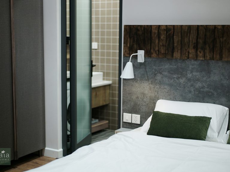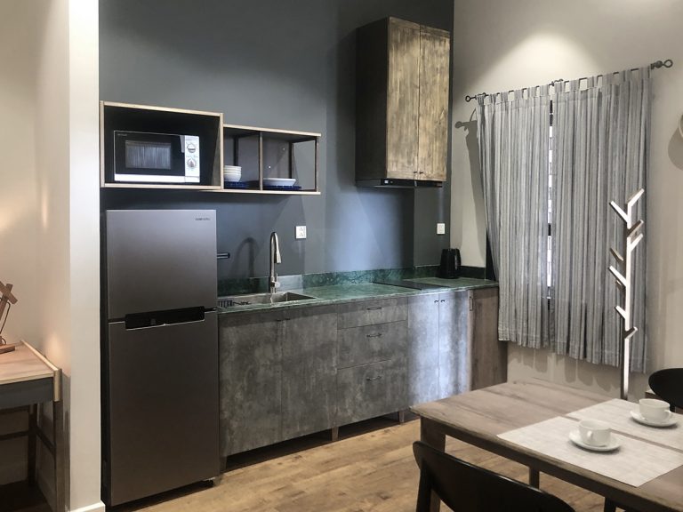 Each room featured by a private balcony, overlooking the green garden view, a well-equipped kitchen, and a custom writing desk pairing with a wide variety of armchairs and sofas, provides a relaxing yet cozy & homelike-feeling living space.